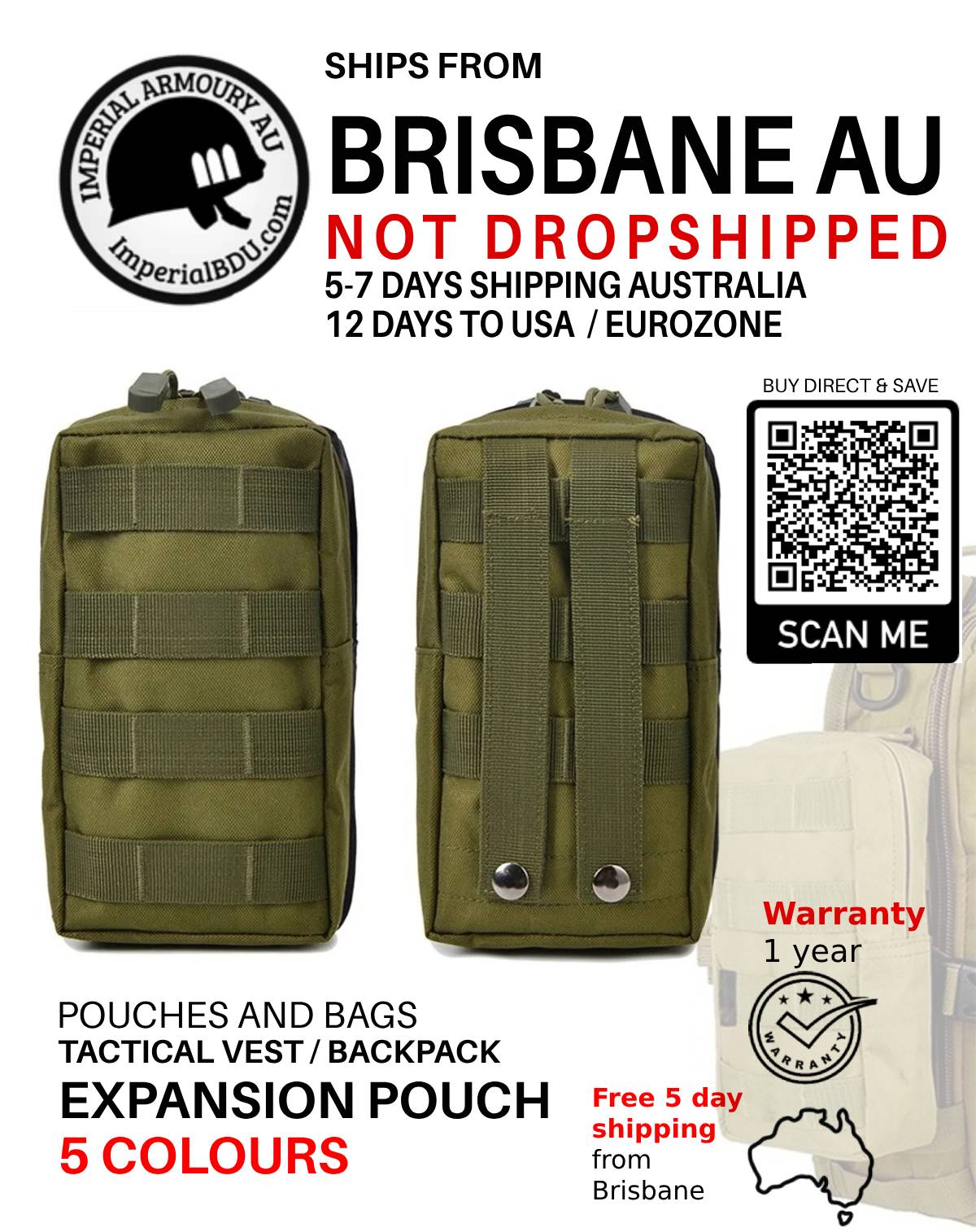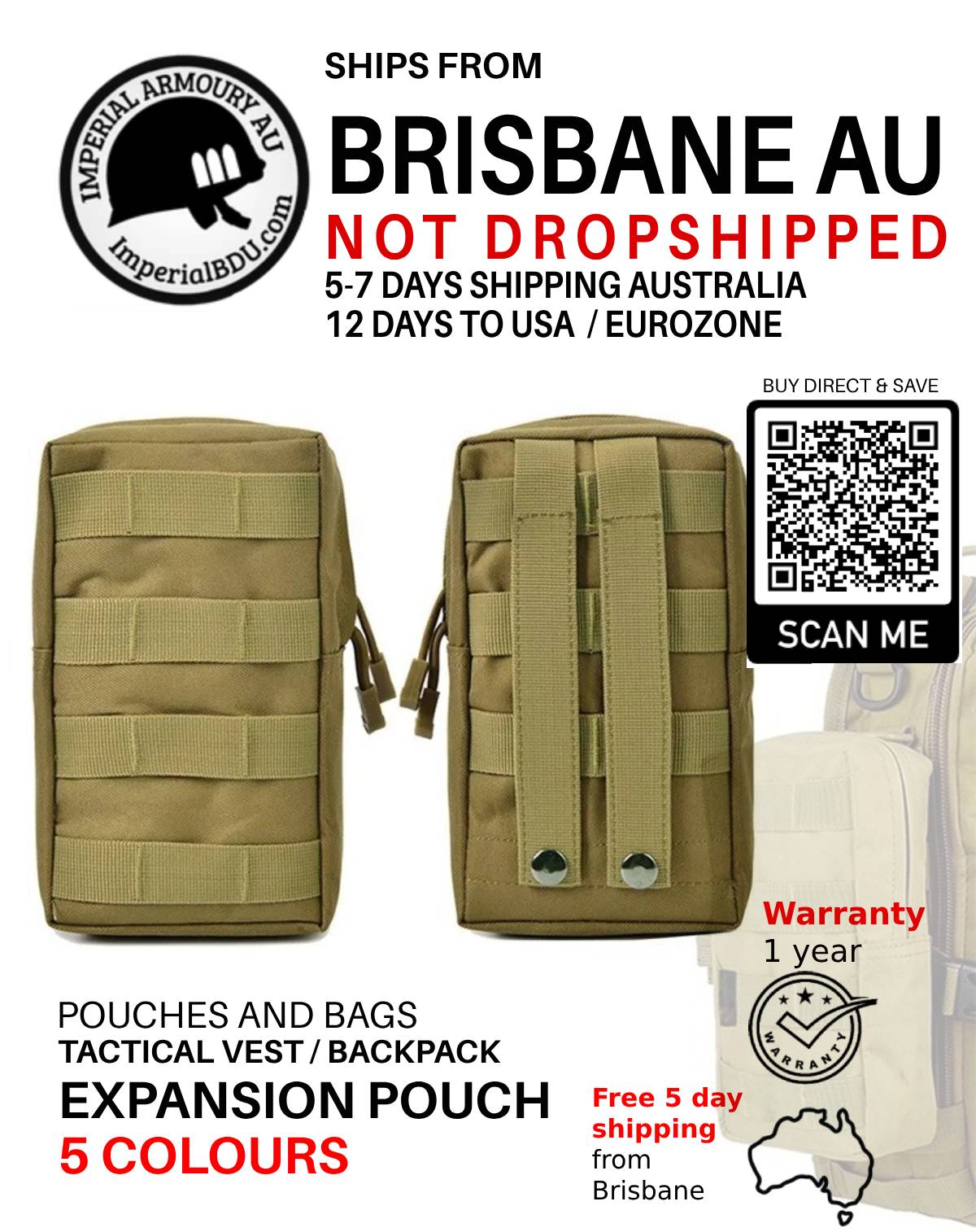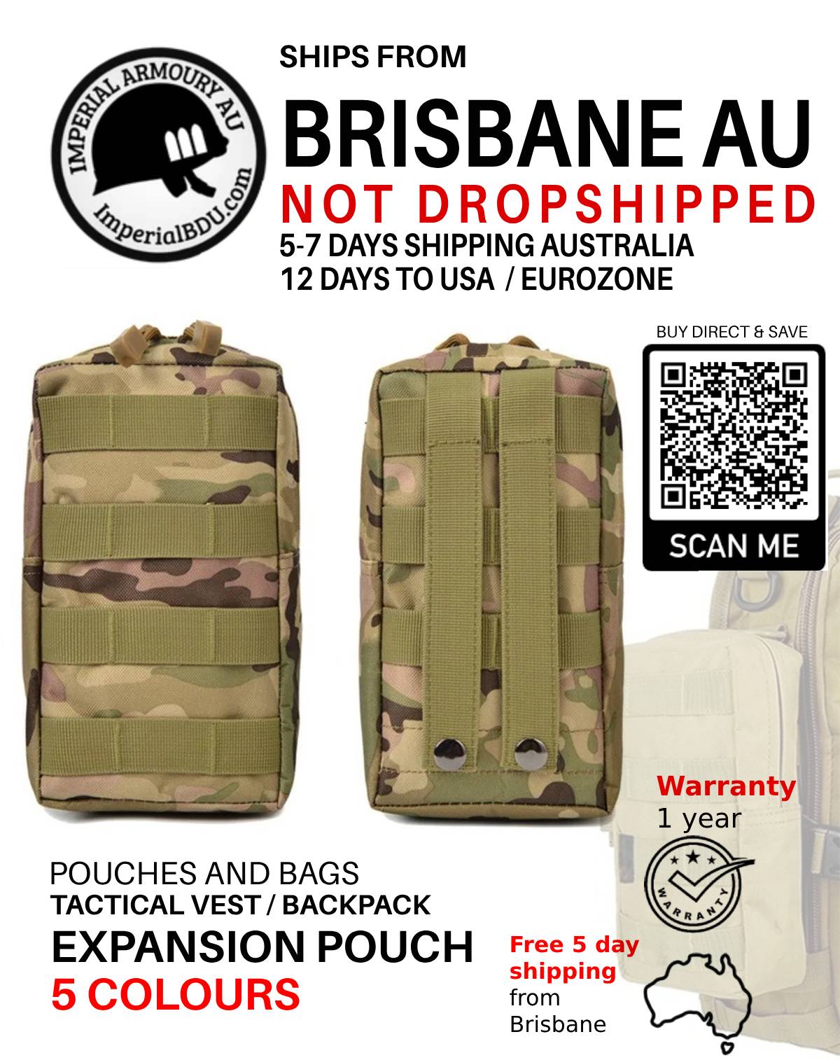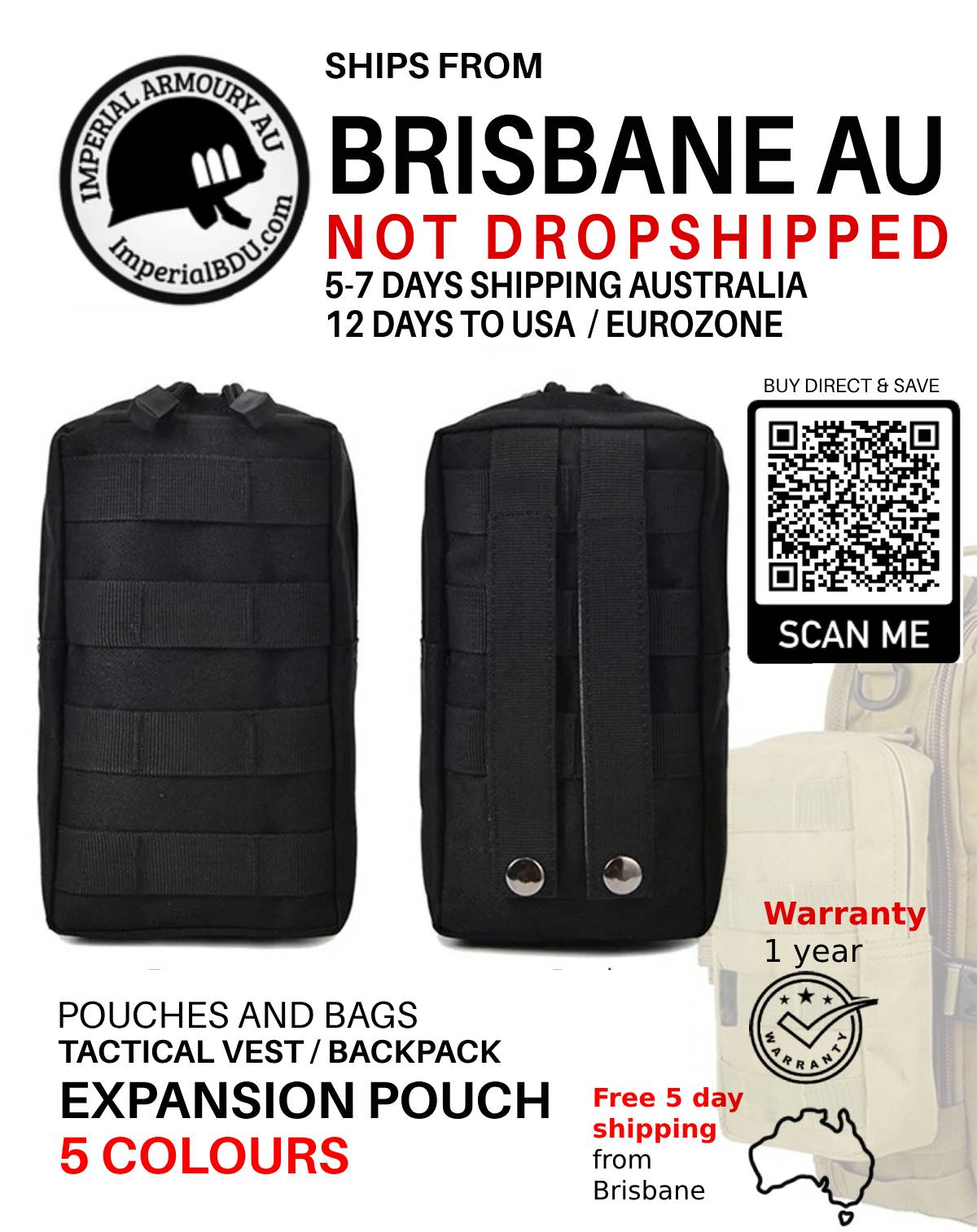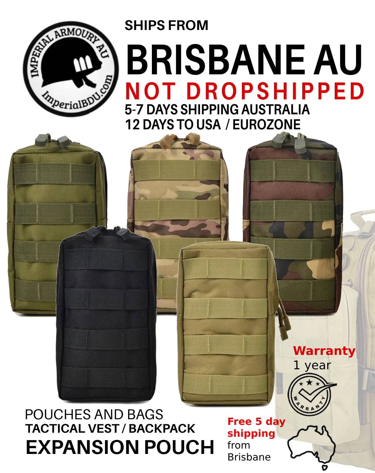 NOT DROPSHIPPED 22 CM / 8.6 IN expansion pouch from Brisbane city, suits medkit, tools, radio, snacks and energy drinks. Free shipping applies to Australian customers only.